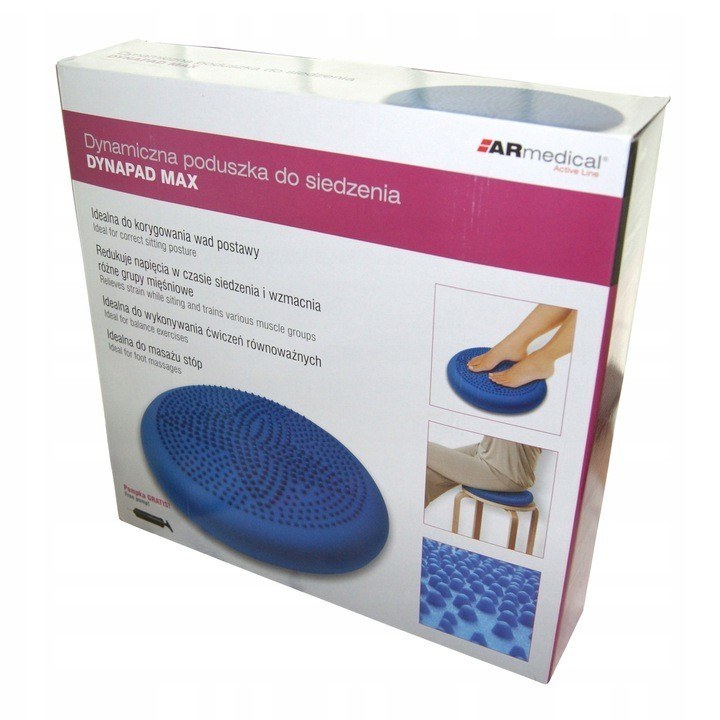 Profesjonalna poduszka sensomotoryczna DYNAPAD MAX przeznaczona jest do korygowania wad postawy oraz wzmocnienia mięśni grzbietu. Dzięki swoim właściwościom pozwala zachować prawidłową pozycję i stymulować mikroruchy krążków międzykręgowych. Zalecana jest wszystkim tym, którzy dużo czasu spędzają w pozycji siedzącej. Dysk sensoryczny to nie tylko korektor postawy to również przyrząd relaksujący. Produkt ma kształt dysku pompowanego powietrzem z miękkimi masującymi wypustkami, które stymulują receptory na skórze działając pobudzająco. Dzięki wyposażeniu w zaworek do regulacji ciśnienia, istnieje możliwość dopasowania właściwej twardości poduszki. Dysk wykonany jest z elastycznego, antypoślizgowego materiału wysokiej jakości ECOfriendly PVC, który nie zawiera substancji toksycznych oraz metali ciężkich.