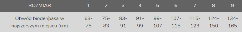 | Obwód bioder/pasa w najszerszym miejscu (cm) | 63-75 | 75-83 | 83-91 | 91-99 | 99-107 | 107-115 | 115-123 | 124-150 | 134- |