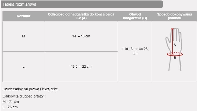 | Rozmiar | Odległość od nadgarstka do końca palca II-V (A) | Obwód nadgarstka (B) | Sposób dokonywania pomiaru |