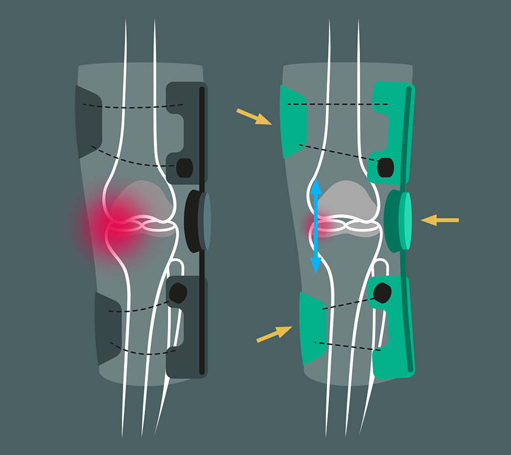 | – | wybór 2 opcji ustawienia ortezy: medial/lateral – ochrona części przyśrodkowej/bocznej kolana |