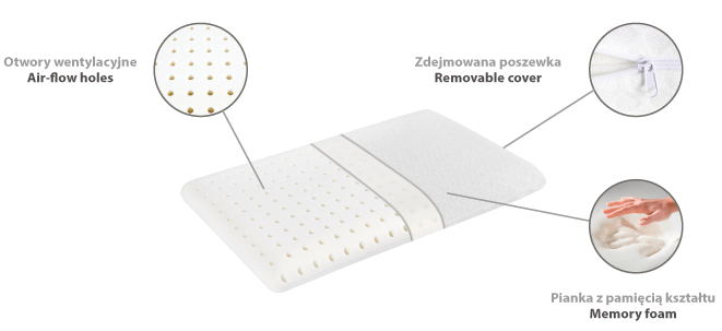 Pianka z pamięcią kształtu nie nadaje się do prania. Pokrowiec zewnętrzny jest zdejmowalny i może być prany w temperaturze do 30°C/ 86°F. Ze względu na sposób transportu, poduszka po wyjęciu z opakowania może mieć „zapach fabryczny”. Aby zniknął, przed pierwszym użyciem, wystarczy przewietrzyć poduszkę.