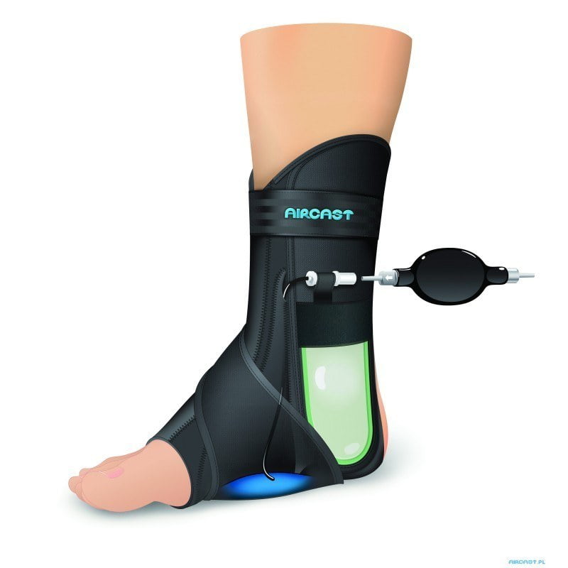 Stabilizator stawu skokowego AirLift 02P Firmy Aircast, skonstruowany tak by zapewnić podparcie i stabilizację przy dysfunkcji ścięgna piszczelowego tylnego lub płaskostopia nabytego. Anatomicznie wyprofilowane łuski pomagają we właściwym ułożeniu kostki oraz zapewniają optymalną stabilizację. Stabilizator jest wyposażony w pompke do regulowanie komór powietrznych w ortezie.