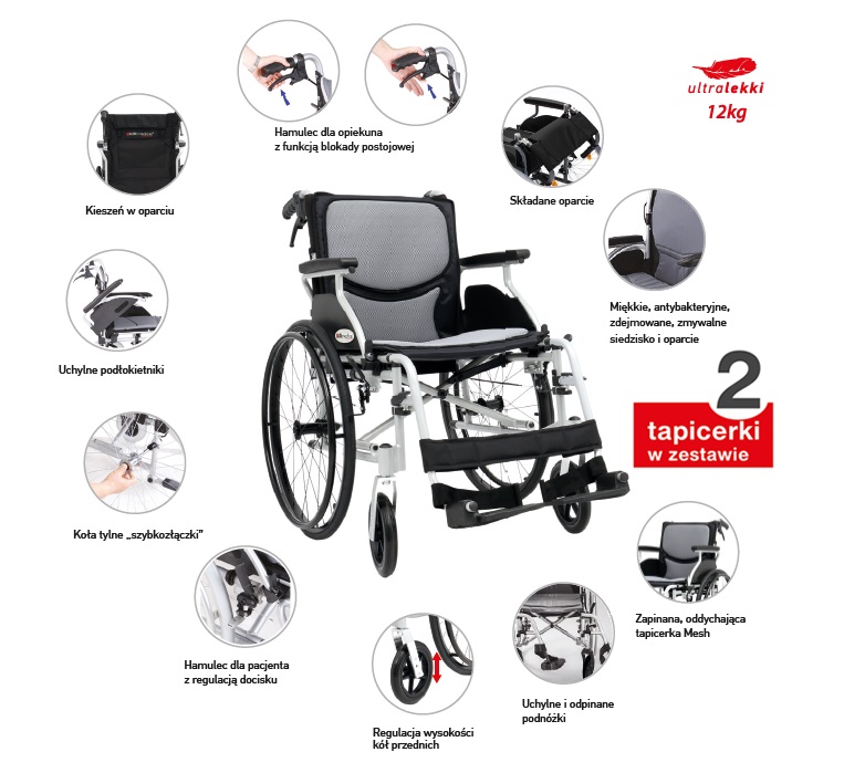 *- akcesoria: hamulec dla opiekuna, pas zabezpieczający łydki, dodatkowa dopinana tapicerka zmywalna oraz druga tapicerka siatkowa Mesh.
