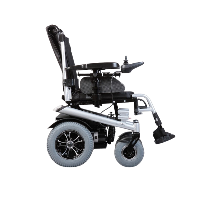 Wózek inwalidzki z nowoczesną, aluminiową ramą ze składanym oparciem. Model o napędzie elektrycznym umożliwia również regulację głębokości oraz kąta nachylenia siedziska i oparcia. Dodatkowo regulowane są również podnóżki, uchwyt na kule oraz możliwość przełożenia jednostki sterującej dla opiekuna.