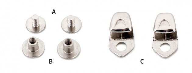 Zestaw mocujący do ortezy AM-OSS-21/CCA składa się z 6 elementów – 2 śrubek z gwintem (A), 2 nakrętek (B) oraz 2 haczyków (C).